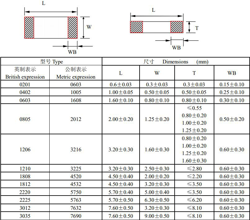 風華MLCC陶瓷貼片電容結構尺寸圖如下