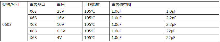以上是國巨CC X6S 0603 貼片電容的常用參數表。
